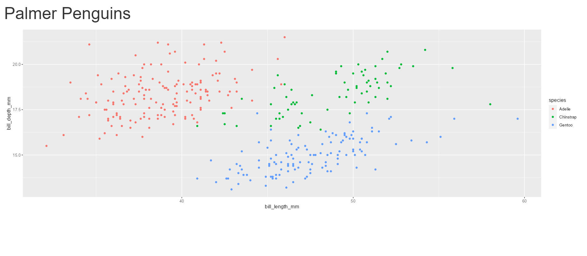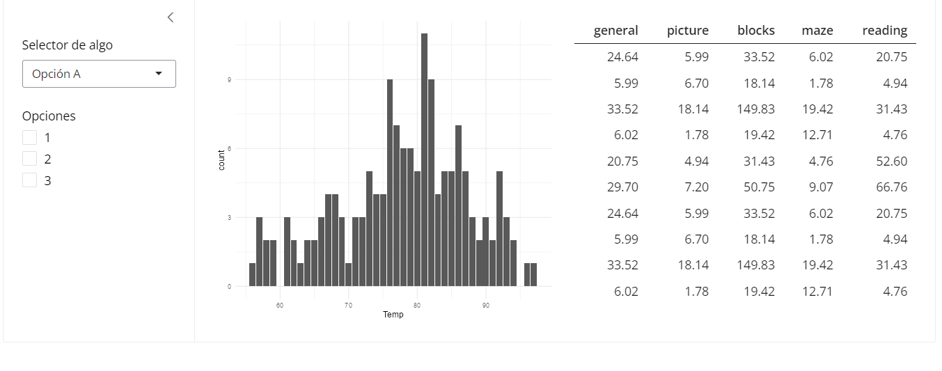 class: center, middle, inverse, title-slide .title[ # Introducción a Shiny ] .subtitle[ ## Server ] .institute[ ### Estación R ] --- class: center, middle inverse # Server --- # Server El servidor es el que le da vida a nuestra app: todos los inputs y outputs que creamos requieren de algo que los una y renderice para que sean funcionales. Como la UI, el server también se construye como una función: ``` server <- function(input, output, session) {...} ``` donde - `input` es el parámetro que nos permite acceder a los valores de los inputs definidos en la UI, es decir, que el servidor puede recibir la información provista por el usuario. - `output` por el otro lado, permite conectarnos con los outputs declarados en la UI y mostrarlos, es decir, enviar información desde el servidor al navegador. - `session` que sirve para acceder a información relacionada con la sesión iniciada por el usuario. La función del server se ejecuta cada vez que comienza una nueva sesión creando un entorno nuevo, de manera de garantizar la independencia entre sesiones. --- # Server ¿Cómo podemos entonces renderizar un output? Para cada tipo de output definido en la UI, le corresponde una función de **render** en el server: <img src="recursos/outputs-renders.png" width="85%" style="display: block; margin: auto;" /> Fuente: https://shiny.posit.co/r/getstarted/build-an-app/reactive-flow/render-functions.html --- # Server <br> Las funciones de render nos permiten "rellenar" los espacios en blanco que habíamos declarado en la UI con las funciones de output (plotOutput(), tableOutput(), etc.), convirtiendo el código R correspondiente en una salida interpretable por el navegador. De la misma forma que existen outputs por fuera de las funciones de Shiny base, existen renders para otros paquetes: - `gt::render_gt()` - `reactable::renderReactable()` - `plotly::renderPlotly()` - etc. --- # Server <br> ¿Cómo se renderiza? ``` output$distPlot <- renderPlot({ ... }) ``` - `output` llama a nuestro objeto que lista todas las salidas de la UI - `$id` accedemos al ID declarado para el output - `renderAlgo()` llamamos a la función que se corresponda al tipo de output - `{}` se utilizan para escribir bloques de código - `...` código R que genera nuestro Algo --- # Server Supongamos que tenemos una app sencilla en la que queremos mostrar únicamente el siguiente `ggplot` hecho con el dataset de [Palmer Penguins](https://allisonhorst.github.io/palmerpenguins/) ``` library(ggplot2) ggplot(data = palmerpenguins::penguins, aes(bill_length_mm, bill_depth_mm, color = species)) + geom_point() ``` <!-- --> --- # Server Nuestro código luciría así: ``` library(shiny) library(bslib) library(ggplot2) ui <- page_fluid( h1("Palmer Penguins"), plotOutput("grafico") ) server <- function(input, output) { output$grafico <- renderPlot({ ggplot(data = palmerpenguins::penguins, aes(bill_length_mm, bill_depth_mm, color = species)) + geom_point() }) } shinyApp(ui, server) ``` --- # Server Y nuestra app así:  --- class: center, middle inverse # Prototipo --- # Prototipo <br> Hasta el momento, logramos armar la estructura de la UI de una app, o al menos de una primera versión de la misma, y vimos cómo cargar los output. Antes de profundizar en el server, veamos una herramienta que nos permite tener una mejor idea de cómo podría lucir realmente nuestra app. El prototipado nos sirve para hacer una prueba de concepto de nuestra app, antes de comenzar. Esto puede ser útil para: - Probar y repensar nuestra UI y lógica de server - Recibir *feedback* de otras personas (clientes o colegas, por ejemplo) - Ahorrar esfuerzos - Organizar nuestro calendario de trabajo --- # Prototipo <br> Si bien podemos optar por hacer un dibujo con lápiz y papel o utilizar una herramienta de diseño en particular, el mundo de los paquetes de R nos brinda una opción nativa: [`shinipsum`](https://github.com/ThinkR-open/shinipsum) Este paquete nos provee funciones para generar algunos outputs random que sirven como guía: - random_ggplot() - random_text() - random_table() - etc. También podemos optar por usar [Shiny Assistant](https://gallery.shinyapps.io/assistant/) para generar un app de ejemplo utilizando IA. --- # Prototipo Por ejemplo, tomemos esta app: ``` library(shiny) library(bslib) ui <- page_fluid(title = "Mi Shiny app de prueba", layout_sidebar( sidebar = sidebar( selectInput("selector", "Selector de algo", choices = c("Opción A", "Opción B")), checkboxGroupInput("checkbox", "Opciones", choices = c(1,2,3)) ), layout_columns(plotOutput("grafico"), tableOutput("tabla")) ) ) ``` --- # Prototipo Podemos renderizar nuestros output llamando a las funciones `random_` ``` library(shinipsum) server <- function(input, output) { output$grafico <- renderPlot({ random_ggplot("bar") }) output$tabla <- renderTable({ random_table(10, 5) }) } shinyApp(ui, server) ``` --- # Prototipo  --- # Ejercicio 1. Renderizar los output de la app desarrollada en el último ejercicio. Puede utilizar `shinipsum` o generar el código a partir de un dataset de R. -- Ejemplo en `prototipo_app/app.R` --- class: center, middle inverse # Inputs --- # Inputs <br> Una Shiny con muchos outputs puede cumplir con nuestro objetivo de presentar datos visualmente atractivos pero lo interesante es ofrecerle al usuario interactividad. Para capturar en el server la información que el cliente nos envía debemos utilizar el ID de nuestro input de interés. Recordemos cómo definíamos un input: ``` selectInput(inputId = "selectorColor", label = "Elegir color:", choices = c("Rojo","Azul")) ``` De forma similar a los outputs, llamando a nuestro argumento de input (lista) y nombrando el inputId correspondiente podemos acceder al valor seleccionado por el usuario: ``` input$selectorColor ``` --- # Inputs <br> Los valores de los inputs solo son accesibles en un **contexto reactivo**, condición que cumplen las funciones de render. Así, podemos empezar a hacer nuestra app más interactiva modifica